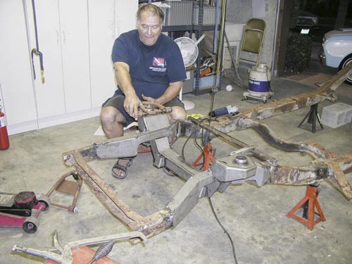 In 2000 I went to TCI and explained which front clip I had and purchased their Mustang II kit for a 35/40 Ford Air Spring IFS minus the cross member and with the optional power rack. I paid $1666 for the kit, minus the cross member, and $160 for the power rack. Finally in late 2005 I dusted off the pieces and started work. After I spot welded the frame kit into place and mocked up the front end I found 3 problems. 1) The power rack I purchased didn't appear to fit the mounting holes on the cross member. This is when I discovered the difference between a manual rack and a power rack. The power rack mounting holes are 15 1/2" apart whereas the manual is 16". Note to others modifying a Mustang II cross member: The entire 1/2" difference is made up entirely on the passenger side. The left side hole remains in the same location. 2) With the upper control arms at their limit of adjustment, I still had too much camber. I never determined the root cause of the problem but I suspect the TCI control arms were made for their cross member. 3) The lower control arm mount for the air spring did not seem to line up to the center of the shock tower. The following pictures detail what at first seemed a pretty scary set of problems that really wound up being nothing. The guys at TCI were a big help. |