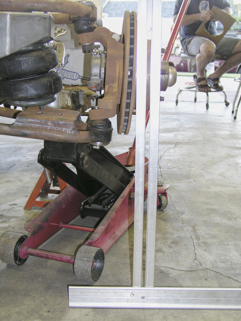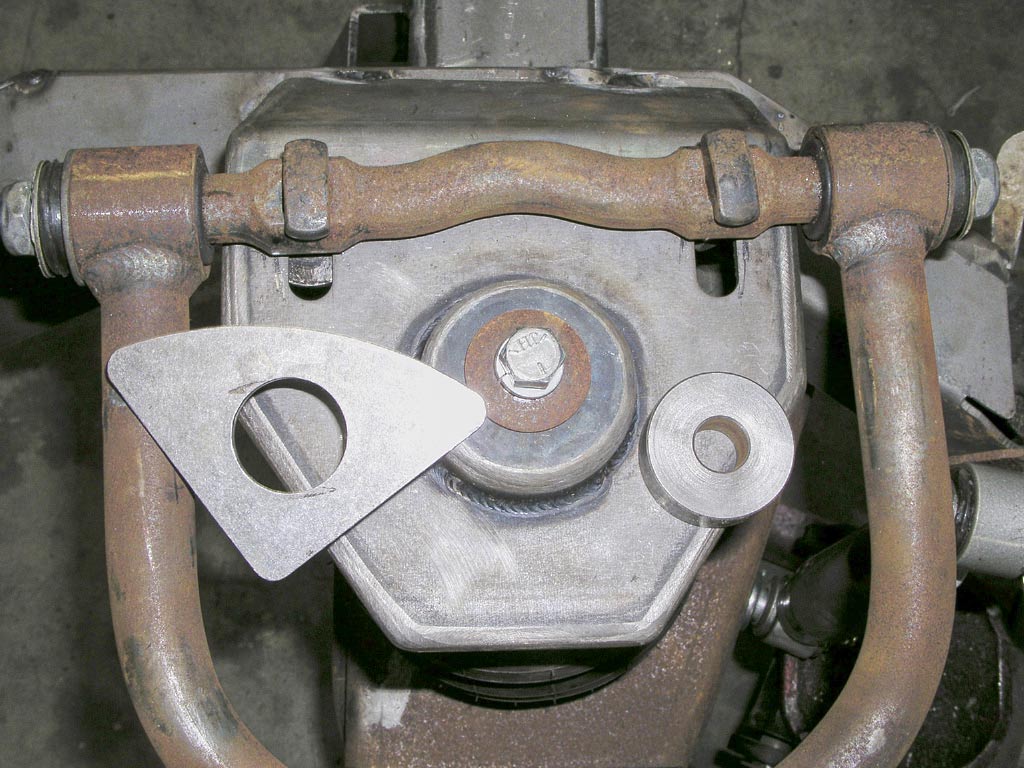 ![]() This view shows my camber problem. The dimension given in the DC Metal instructions was 29 1/4" from the center of each of the upper control arm slots. I was a bit wide at 29 1/2 to maybe 29 3/4, center to center. |