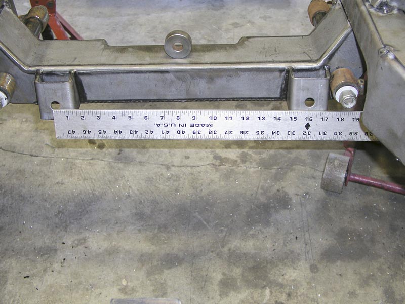 ![]() This view shows that my DC rack mount holes are 16". The rack supplied by TCI is 15 1/2". I determined that the cross member was designed for a manual rack. TCI recommended slotting the passenger side mounting hole 1/2" toward the center of the frame. |