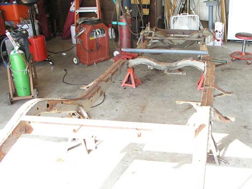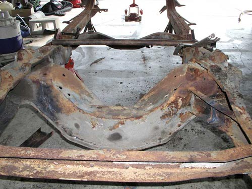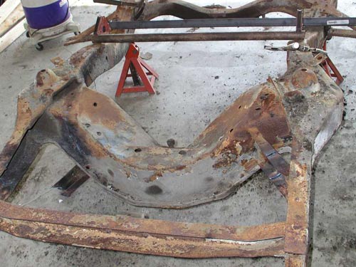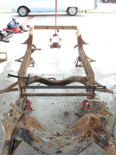 shop in Huntington Beach I realized two things. 1) I really liked the way the frame was modified to accommodate a Mustang II front suspension. 2) I suspected the little company wouldn't be in business very long. So I bought the kit and sure enough, they went out of business soon after. This page shows the frame before the original front cross member was